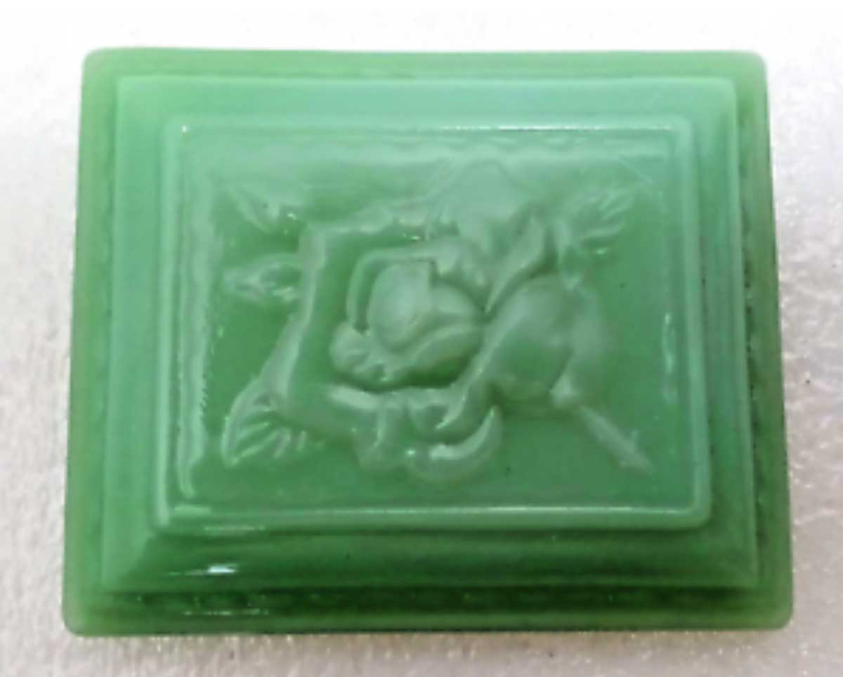 This Royal Ruby Embossed Lid for Anchor Hocking’s Pineapple Prescut Cigarette Box has an embossed rose on the center. It is one of three lids paired with the Crystal Pineapple Prescut Cigarette Box: Royal Ruby Embossed, Crystal (not embossed), and White Embossed. This rose-embossed lid was also made in Jadeite – maybe even other colors. I found the White also paired with a smooth rose-colored cigarette box. The Jadeite I found was paired with a Jadeite smooth cigarette box.