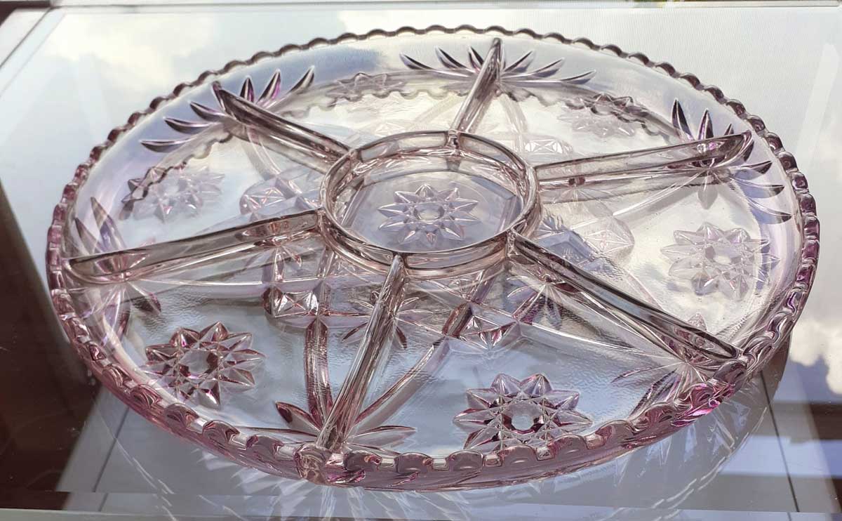 This Divided Platter has seven sections separated by raised dividing lines with a circle in the center. Six straight lines radiate out from the center circle to create six sections on the outside. The shades of the Rose-Lilac Platters vary greatly.